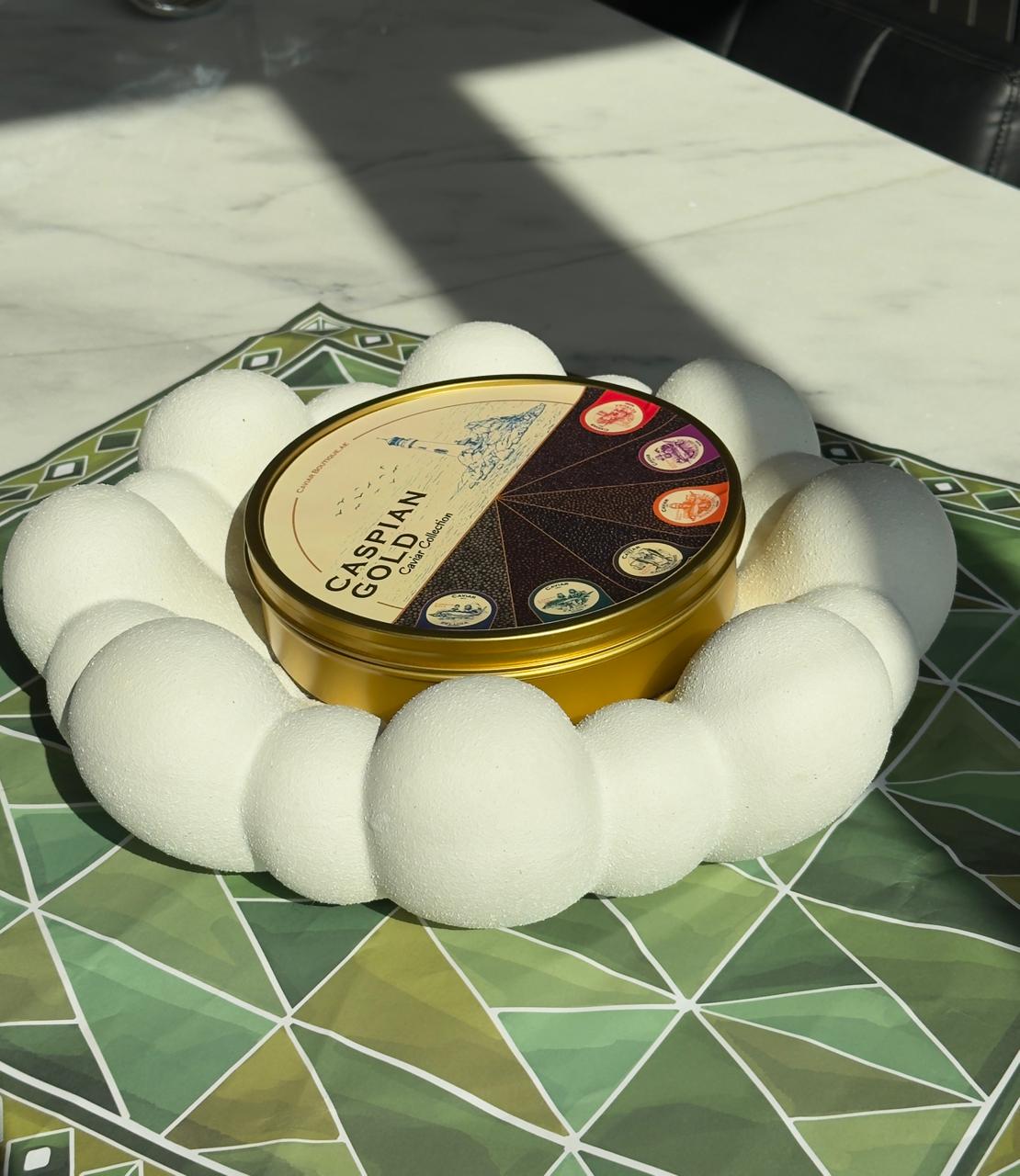 Elegant shell-shaped serving bowl designed for refined caviar and seafood presentation. Its sculptural textured surface adds a luxurious visual accent and elevates any table setting. With a 35 cm diameter and 11 cm height, it is perfectly sized for ice displays and premium event styling, creating a sophisticated focal point for private dinners and exclusive receptions.