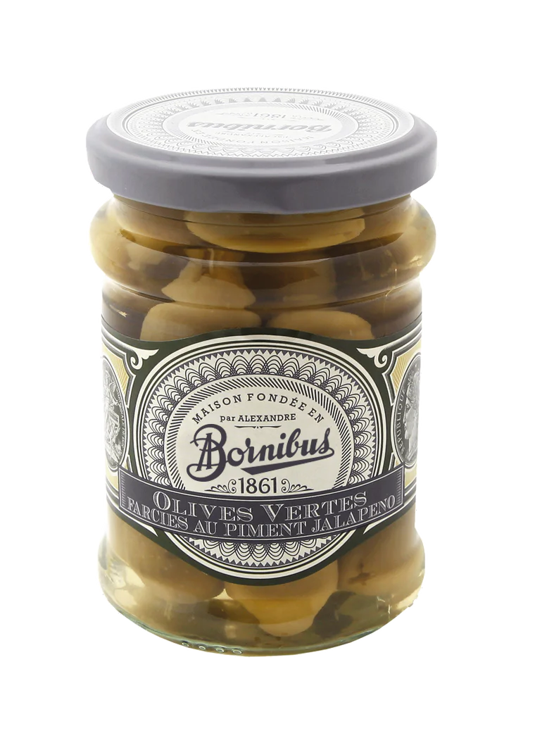 Bornibus jalapeño-stuffed olives combine the fruity aroma of green olives with a medium-hot Mexican chili pepper that will quickly distinguish itself from your other appetizers.